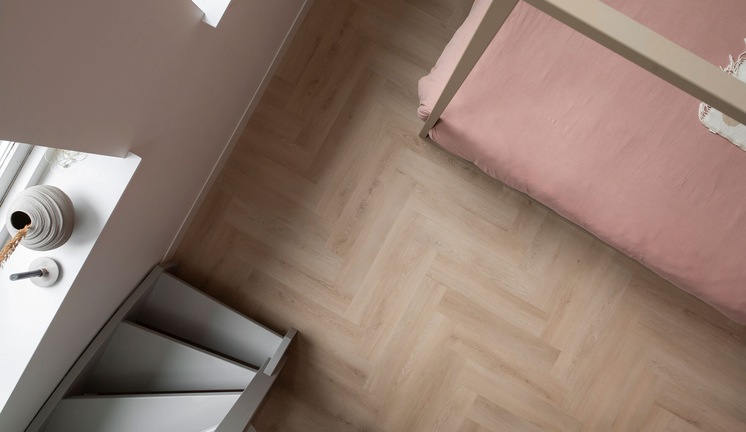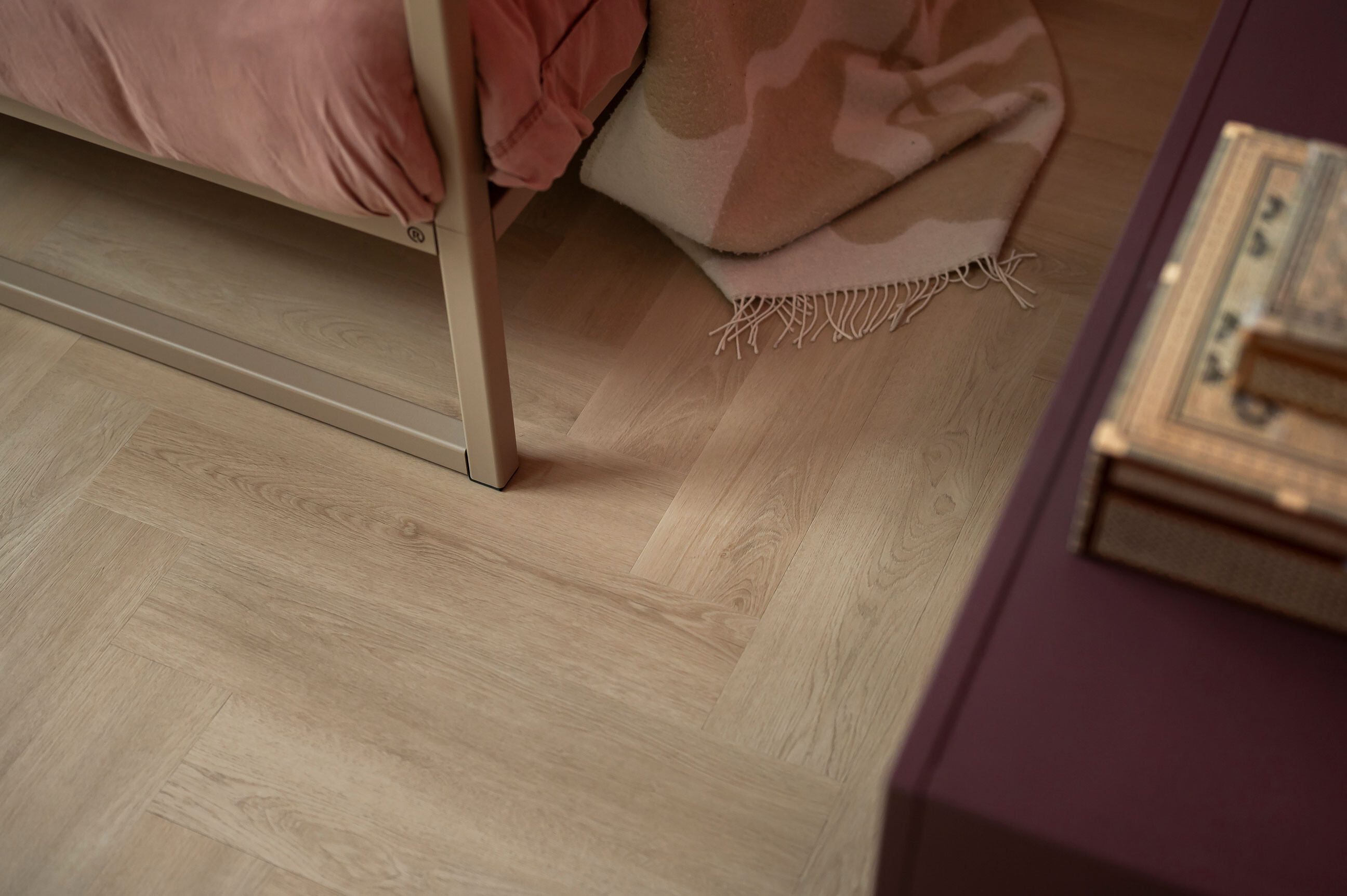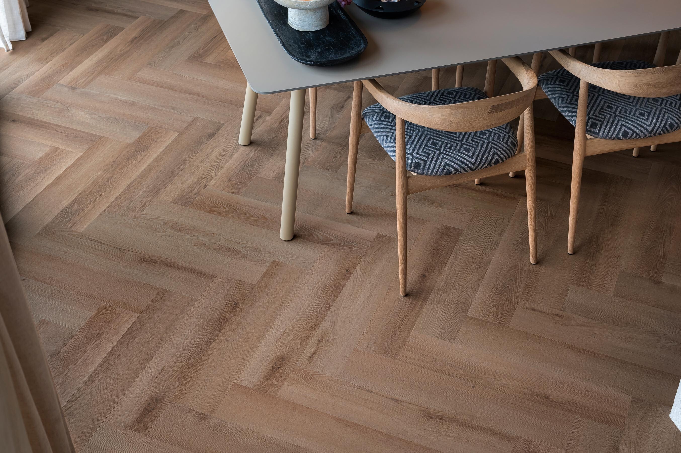 Elke strook ligt direct op de ondergrond. Je ziet geen oplopende randen en geen kleine hoogteverschillen. Het oppervlak leest als één vlak geheel, wat vooral bij visgraat mooi zichtbaar is.