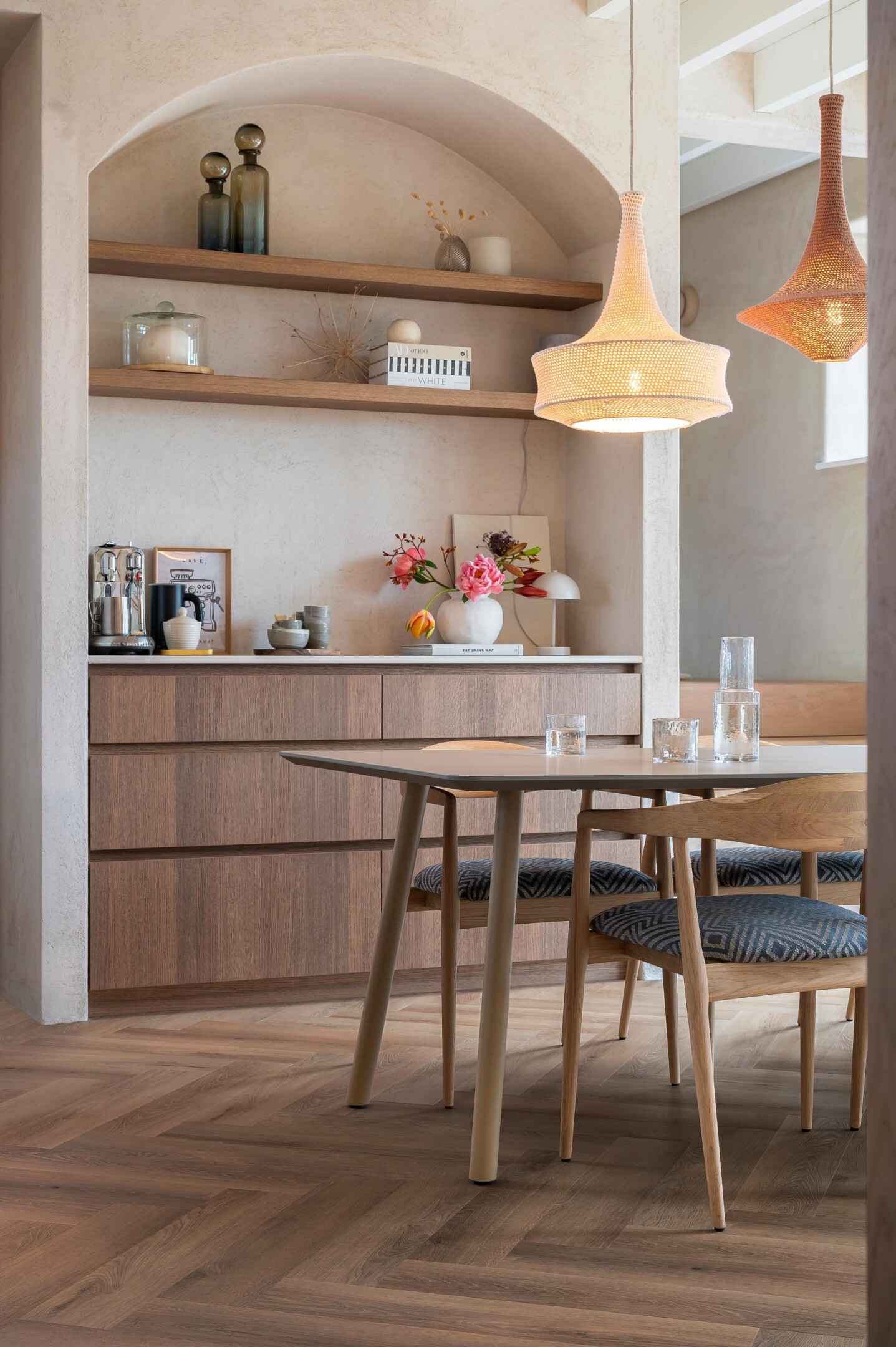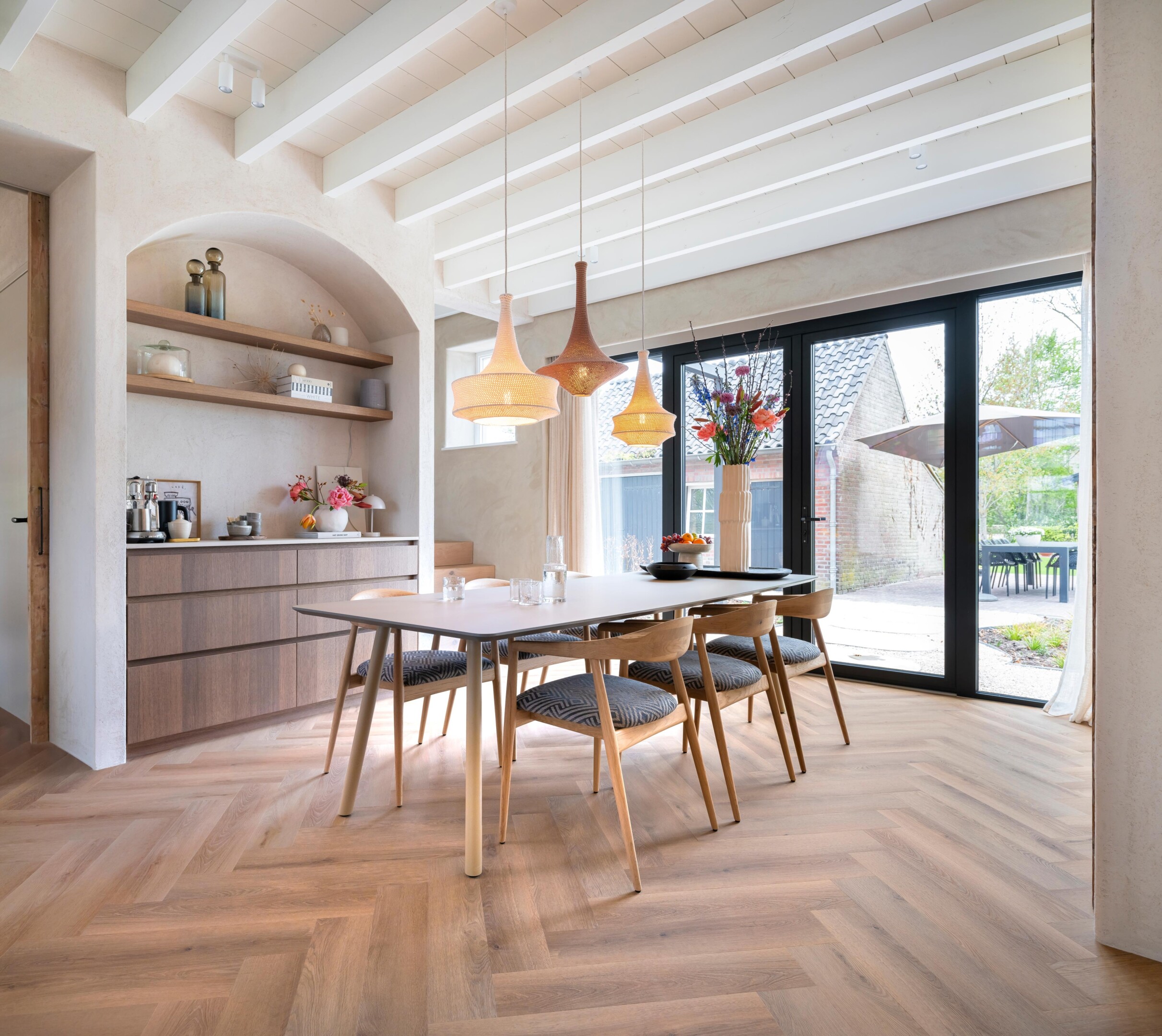 Wanneer zowel de vloer als de keuken licht zijn, ontstaat er een frisse, kalme basis. Het daglicht beweegt onbelemmerd door de ruimte. De keuken voelt groter en helderder, vooral in woningen met veel ramen of open woonkeukens.