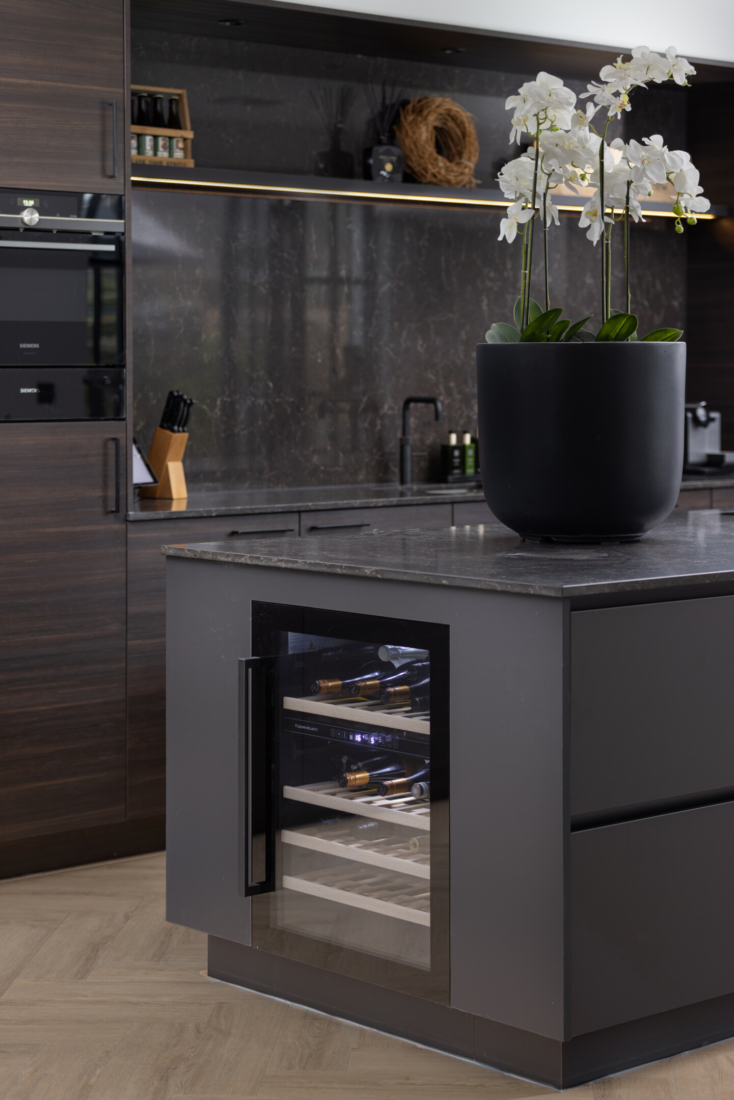 Wanneer een donkere keuken op een lichte vloer staat, ontstaat er direct lucht en contrast. De ruimte voelt opener. De donkere fronten komen sterker naar voren en het keukenblok lijkt visueel los te komen van de grond.