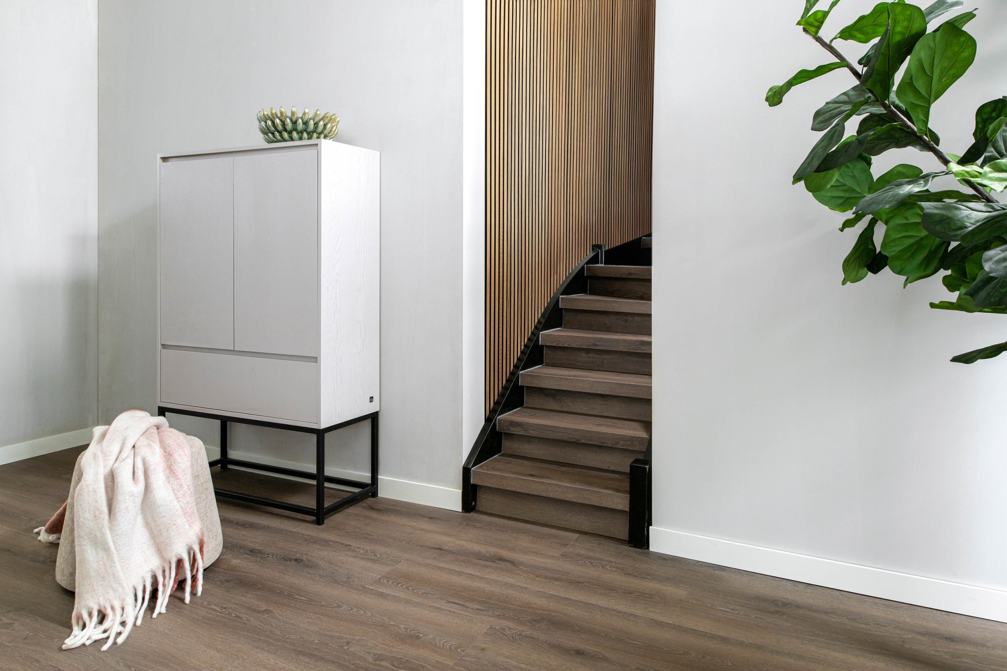 - Een donkere PVC-vloer vangt het licht, waardoor schaduwen dieper worden en de ruimte warmer en intiemer oogt.