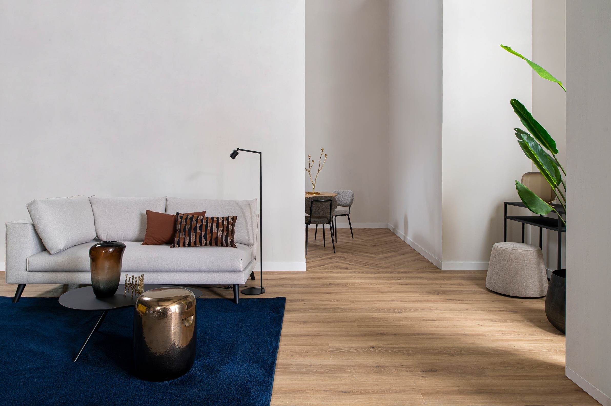 Je ziet hoe de tint meekleurt met jouw interieur. Een vloer met een subtiele beige ondertoon kan naast een houten kast ineens veel warmer lijken.