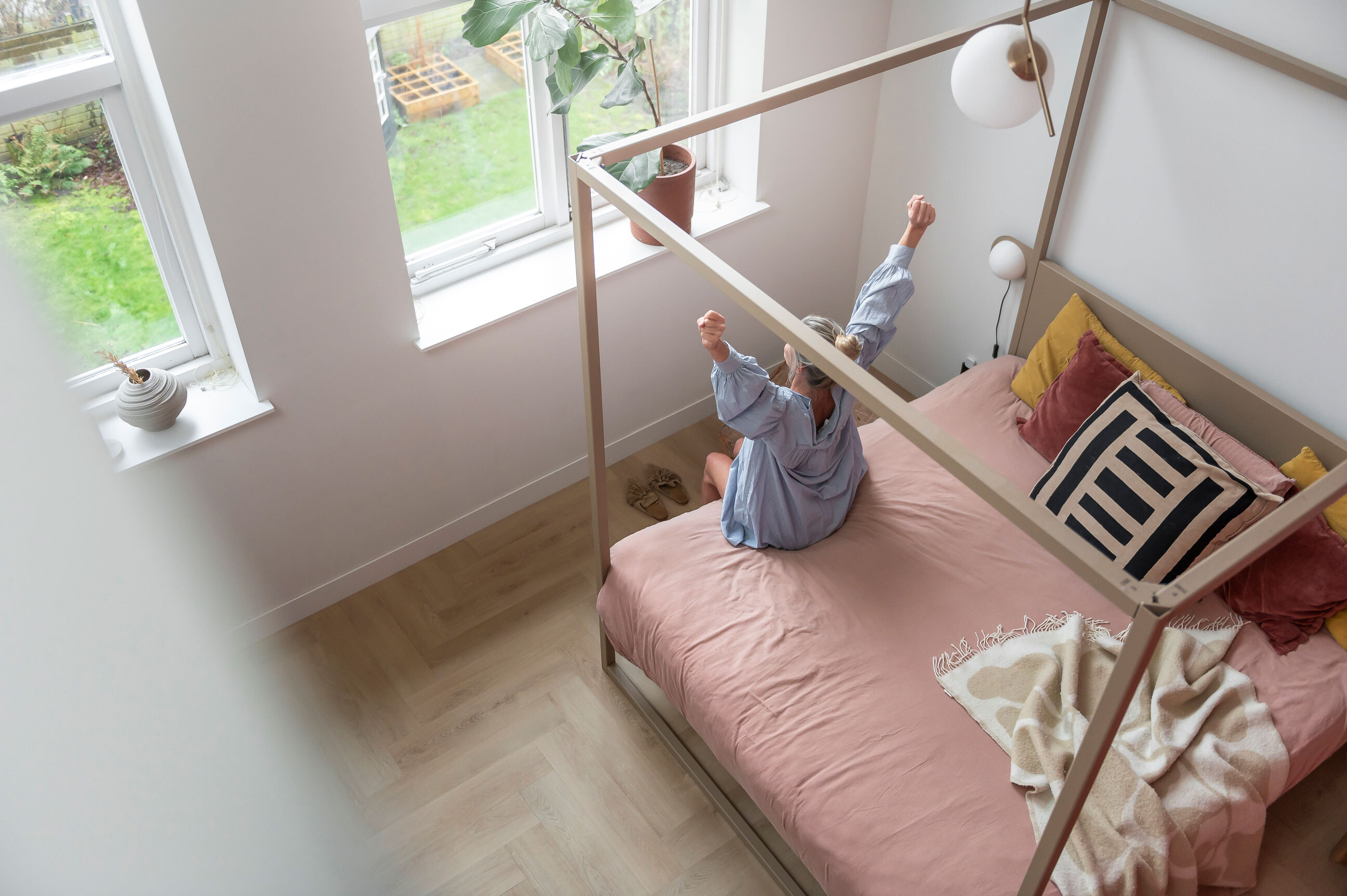 Wanneer een lichte vloer wordt gelegd, gebeurt er iets bijzonders. Het daglicht beweegt makkelijker door de ruimte. De contouren van de muren vervagen iets, waardoor de kamer opener oogt. Een matte structuur versterkt dat effect. Het licht wordt zacht verspreid en de vloer vormt een rustige basis waar de kamer optisch van profiteert. Vooral in ruimtes met één raam werkt dit opvallend sterk: het licht lijkt verder door te lopen dan de fysieke ruimte zelf.