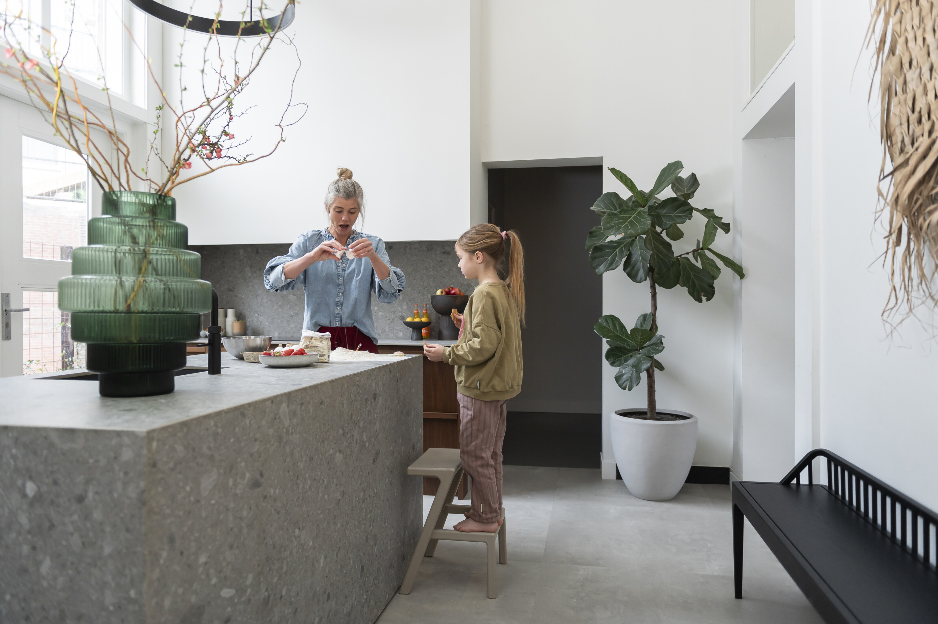 Een PVC-vloer in een moderne betonlook matcht perfect met een design interieur. Dit type vloer versterkt de strakke uitstraling van de ruimte en biedt tegelijkertijd het comfort van een duurzame en onderhoudsvriendelijke vloer. Een eco PVC-vloer met een matte afwerking past ook mooi binnen deze stijl, omdat het deze minimalistische look een duurzaam karakter geeft.