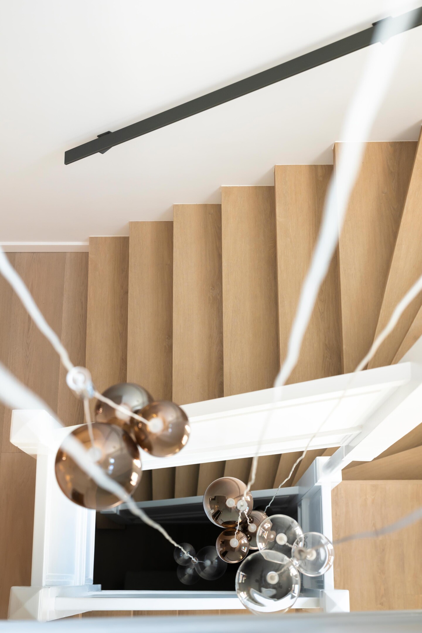Door te kiezen voor een PVC-oplossing is deze trap niet alleen mooi, maar ook functioneel. Het oppervlak is slijtvast, geluiddempend en antislip, ideaal voor intensief gebruik in een representatieve omgeving. De voelbare houtstructuur en natuurlijke kleurschakeringen geven het geheel een warme en hoogwaardige uitstraling.
