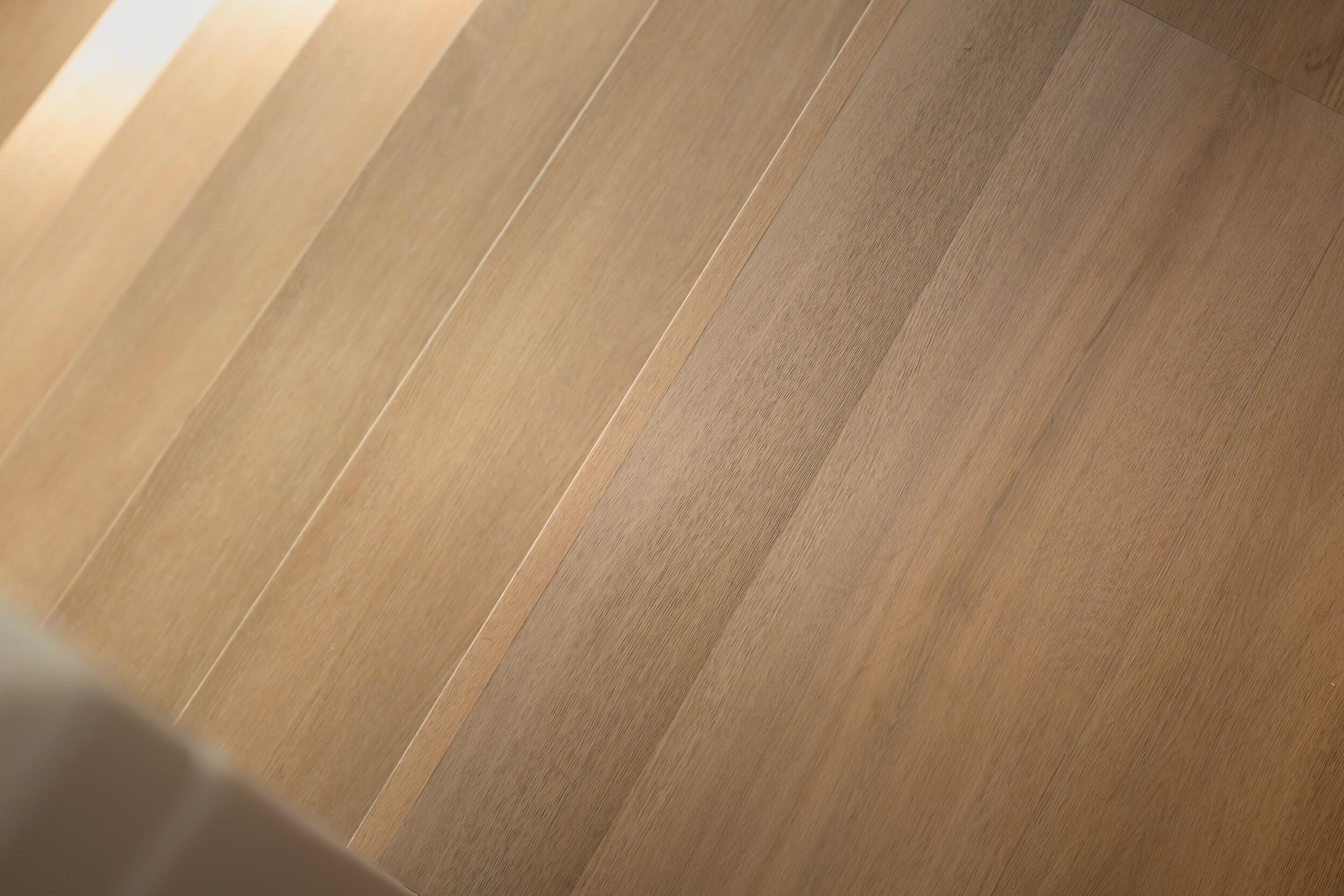 Voor de showroom van Bang & Olufsen in Katwijk realiseerde Hebeta een stijlvolle traprenovatie met de Charente XL Plank in naturel licht eiken (5446). Het gaat om een draaitrap die meerdere verdiepingen verbindt. De trap is één visueel geheel, dankzij de doorlopende afwerking in dezelfde warme houttint als de vloer.